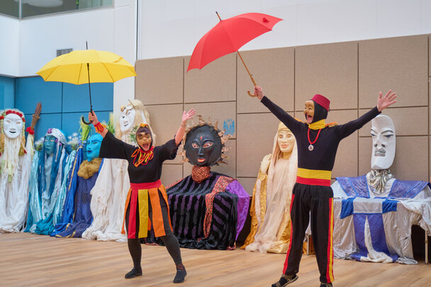 Lær om det, som er specielt ved de forskellige masker og oplev KOSMOS medvirkende i fuld fart med at spille deres farverige maskefigurer.