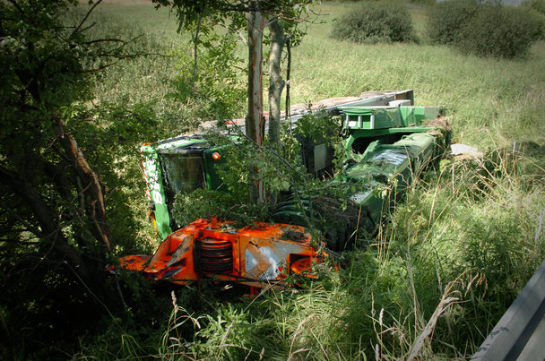 Denne uheldige BMS kran kom på afveje da den kørte på Søskovvej mellem Brabrand og Stavtrup og kom lidt for langt ud i rabatten. På grund af den regnvåde juli måned var den alt for blødt til at bære vægten af det tunge køretøj som efterfølgende måtte en tur i grøften