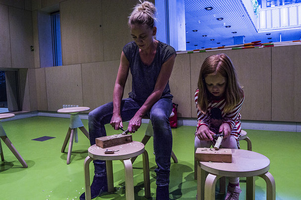 Der var også plads til at små søskende kunne komme med, og kravle rundt på gulvet mens de større søskende prøvede kræfter med at snitte i træ.