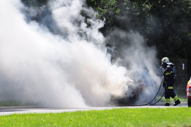 Pludseligt gik der brand i en bil midt på Grenåvej, og mens slukningsarbejdet stod på blev trafikken stoppet i begge retninger pga røg.
