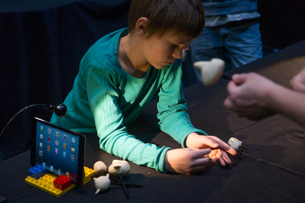 Trods det flotte vejr havde 30 børn og voksne valgt at tilbringe eftermiddagen i dæmpet belysning indendørs. Kun lyset i børnenes øjne - og lamperne, der skulle belyse figurerne sørgede for illumination af de fantastiske stop-motionfilm, der voksede frem på iPadden. Workshoppen blev ledet af Kasper Bæk Jørgensen, der er uddannet animator på ’The Animation Workshop’ i Viborg.