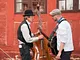 Vagtskiftet ved Marselisborg Slot skærtorsdag kl. 12 tiltrak mange fremmødte, mens politiets indsatsleder undervejs tog sig tid til at besvare spørgsmål fra en nysgerrig dreng.