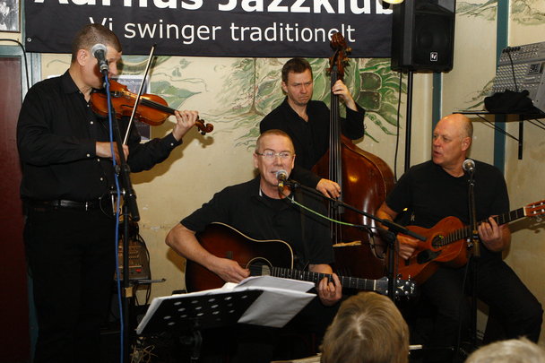 Frokostjazz HOS ANDERS var i dag præget af godt humør, spilleglæde og overraskelser. Kvartettens spillede swingmusik. Hele vejen igennem loyale overfor den originale spillestil, som den blev grundlagt i 30-erne, og med de yderst veloplagte solister i front på violin og guitar. Esben Kjær: violin, vokal. Per Sørensen: guitar, vokal. Ole Bech: guitar. Ole Ulvedal: bas.