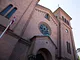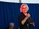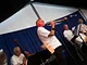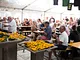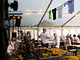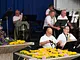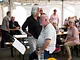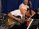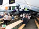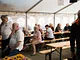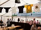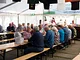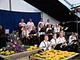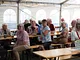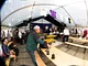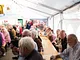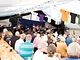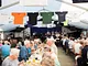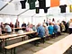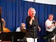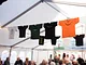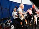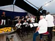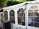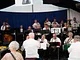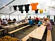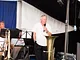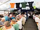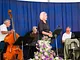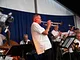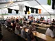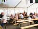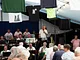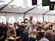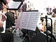 Et telt på en kirkeplads, fyldt med publikum og et jazz orkester.