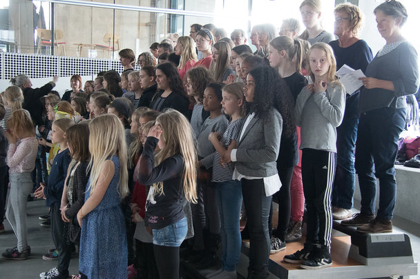 Ordet ’kor’ var her i flertal. Kochs Skoles kor bestod nemlig ved denne lejlighed af to børnekor, et ungdomskor og et voksenkor. Elever fra skolens 2.-10. klasse, forældre og lærere - i alt ca. 100 sangglade børn, unge og voksne - slog sig sammen og foldede stemmerne ud, da de indtog Rampen på Dokk1.