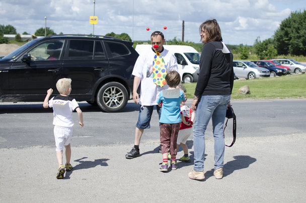 Ca. 60 mennesker var kommet forbi for at støtte op om hospitalsklovnenes gode sag. Det blev til en god dag med massere af grin og sved på panden.