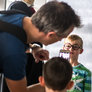 Vagtskiftet ved Marselisborg Slot skærtorsdag kl. 12 tiltrak mange fremmødte, mens politiets indsatsleder undervejs tog sig tid til at besvare spørgsmål fra en nysgerrig dreng.