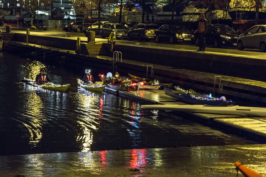 Traditionen tro blev der pyntet kajakker, kanoer og SUPs for at ror lyset frem fra bugten til byen.