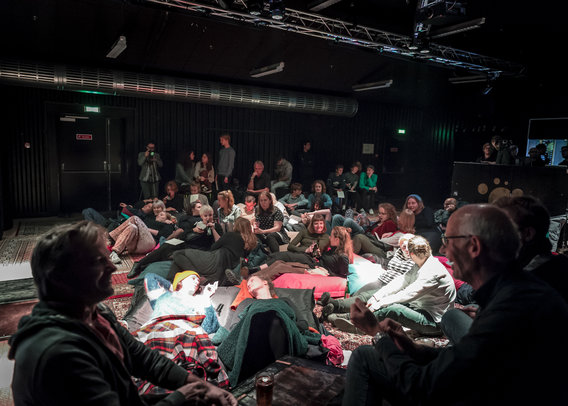 RADAR's koncertsal var transformeret til en rigtig hyggestue med tæpper, puder og sækkestole. Publikum hyggede mens den Århusianske elektronisk musikduo Schweppenhäuser/Thomsen spillede en audio poesi af Morten Søndergaard.
