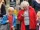 Vagtskiftet ved Marselisborg Slot skærtorsdag kl. 12 tiltrak mange fremmødte, mens politiets indsatsleder undervejs tog sig tid til at besvare spørgsmål fra en nysgerrig dreng.