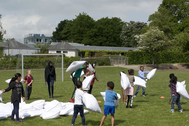 Boligforeningerne i Frydenlund og Frydenlund Fælleshus i samarbejde med Sundhedsstyrelsens Get Moving-kampagne invitererde til kæmpe pudekamp på plænen ved Bogfinkevej 1-9 Søndag den 29. kl. 11.00-12.00.