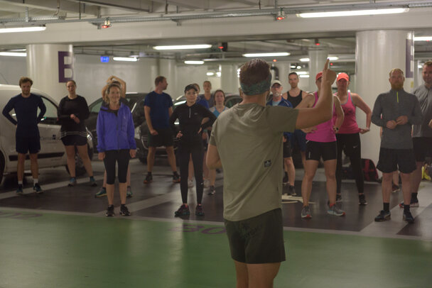 Samtidig ramte et tordenvejr så derfor begyndte træningen af sikkerhedsgrunde i parkeringskælderen men da torden var drævet over, rykkede alle ud i sommerregnen.