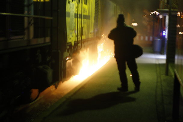 Gnister og støj fra slibetoget