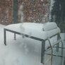 Den kraftige snestorm bevirkede, at sneploven måtte opgive at rydde vejen - men det er nu også hyggeligt at arbejde hjemmefra og betragte vejret indefra
