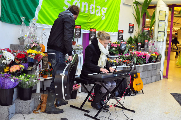 Det var bestemt " En Glad Dreng I Gummistøvler" jeg mødte i SuperBest i Risskov, og dernæst i Bilka, Tilst. Sammen med Fie Hestbech spillede Michael Hamilton egne sange, blandt andet sangen: Som En Tankstation På En Rasteplads På Din Motorvej