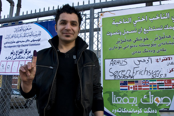 Bakhtiar viser stolt sin pegefinger , som er dyppet i blæk. Den blå finger er beviset på at han har stemt til parlamentsvalget i Irak.