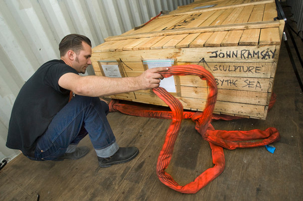 Udstillingen Sculpture by The Sea ankommer i containe til Tangkrogen i Århus