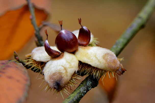 Efterår i skoven, hvor bladene skifter farve og træernes frugter gør klar til formering.