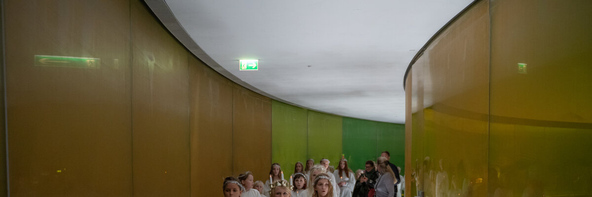 Igen i år kunne hele Aarhus opleve det flotte og spektakulære Luciaoptog, der syngende bevægede sig gennem museet og op igennem bygningen for at ende på toppen af ARoS Your rainbow panorama.